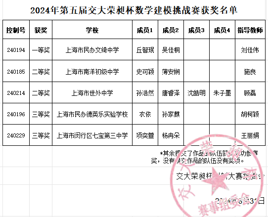 2024年8月24日,第五届交大荣昶杯创新大赛决赛答辩和颁奖典礼在上海交通大学闵行校区隆重举行。这是飞扬的种子科学社团第二次组织参与此项赛事,社团成员们在今年的数学建模赛道中获得了五个奖项,获奖名单如下: